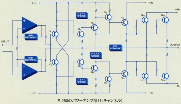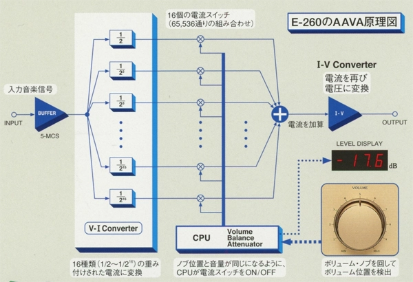 AAVAの雑音を左右する要素の1つに入力バッファーアンプがあります。E-260ではここに高性能アンプを5個並列接続する事で高S/N比を計っています。