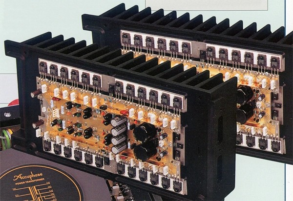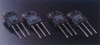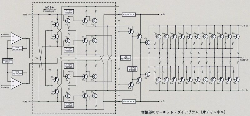 出力段には周波数特性や電流増幅率リニアリティ、スイッチング等の諸特性に優れたコレクター損失150W、コレクター電流15Aのハイパワートランジスタを採用しています。このトランジスタをチャンネル当たり11ペア採用しパラレルプッシュプル構成をとしています。