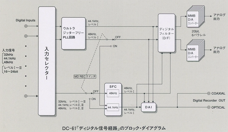 入力された信号はSFCによってサンプリング周波数を44.1kHz/レベルIの高精度信号に変換する事が可能です。