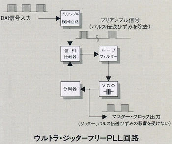 パルス伝送歪は伝送する信号が0と1の間をランダムに変動するために発生します。プリアンブル信号(L/R信号の先頭を示すマーカー)は常に一定間隔かつ一定レベルで発生するため、パルス伝送歪の影響を全く受けません。そこで、DAI信号の中からプリアンブル信号だけを検出してPLL回路に入力する事で、マスタークロックからパルス伝送歪の影響を排除しています。