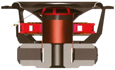 振動板にはレジン強化ペーパー/ケブラーコーンを採用しています。紙とケブラーファイバーを混合する事で、ボイスコイルの強力な駆動力やエンクロージャー内部の気圧変化による変形に耐える振動板を実現しています。この振動板に強化ペーパーダストキャップやカーボンファイバーコイルボビンを組み合わせ、独自の次世代マッシュルーム構造によって一体とし、変形を最小限に抑えています。