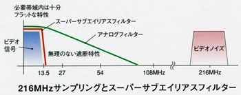 このフィルターは必要帯域内ではフラットな特性を保つ事で映像信号に悪影響を与えないようにし、不要帯域では十分な遮断特性をもつため、折り返しノイズを効果的に除去できます。