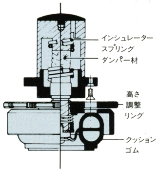このインシュレーターはクッションゴムとインシュレーターポールに内蔵されたスプリングによる二重構造となっており、支点がインシュレーターの上部に設定されているため、システム全体を吊った支持構造となり、重心が低く、縦揺れや横揺れに強い設計となっています。