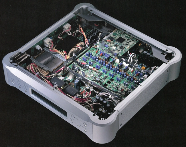 また、重量のあるトランスとバッファアンプ用の±42V用コンデンサはインナーシャーシ上に6mm厚のスチール製ベースで固定しており、基板取り付けと共に高精度化と筐体の高剛性・無共振化を徹底しています。特にスピーカーからの音圧の影響を受けやすい天板は厚さ8mmのものを採用しています。