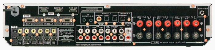 | オーディオ入力 | デジタル:4系統(同軸:1系統(DVR/DVD)、光:3系統(DBS、VTR、Aux)) USB:1系統 アナログ:5系統(TV、DBS、VTR、DVR/DVD(Multi)、Aux) |