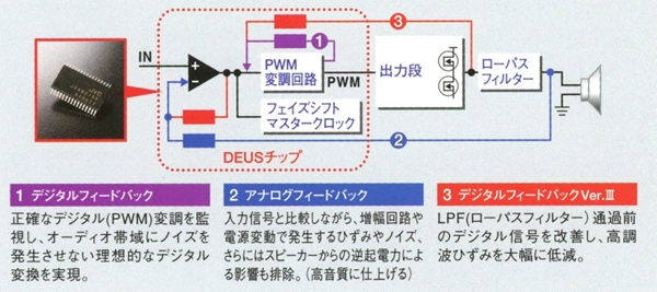 DEUSではデジタルフィードバックを搭載する事でデジタル(PWM)変調を監視し、オーディオ帯域にノイズを発生させないデジタル変換を実現しています。そして、LPF通過後のアナログフィードバック回路では入力信号と比較しながら増幅回路や電源変動で発生する歪やノイズ、スピーカーからの逆起電力による影響を排除しています。